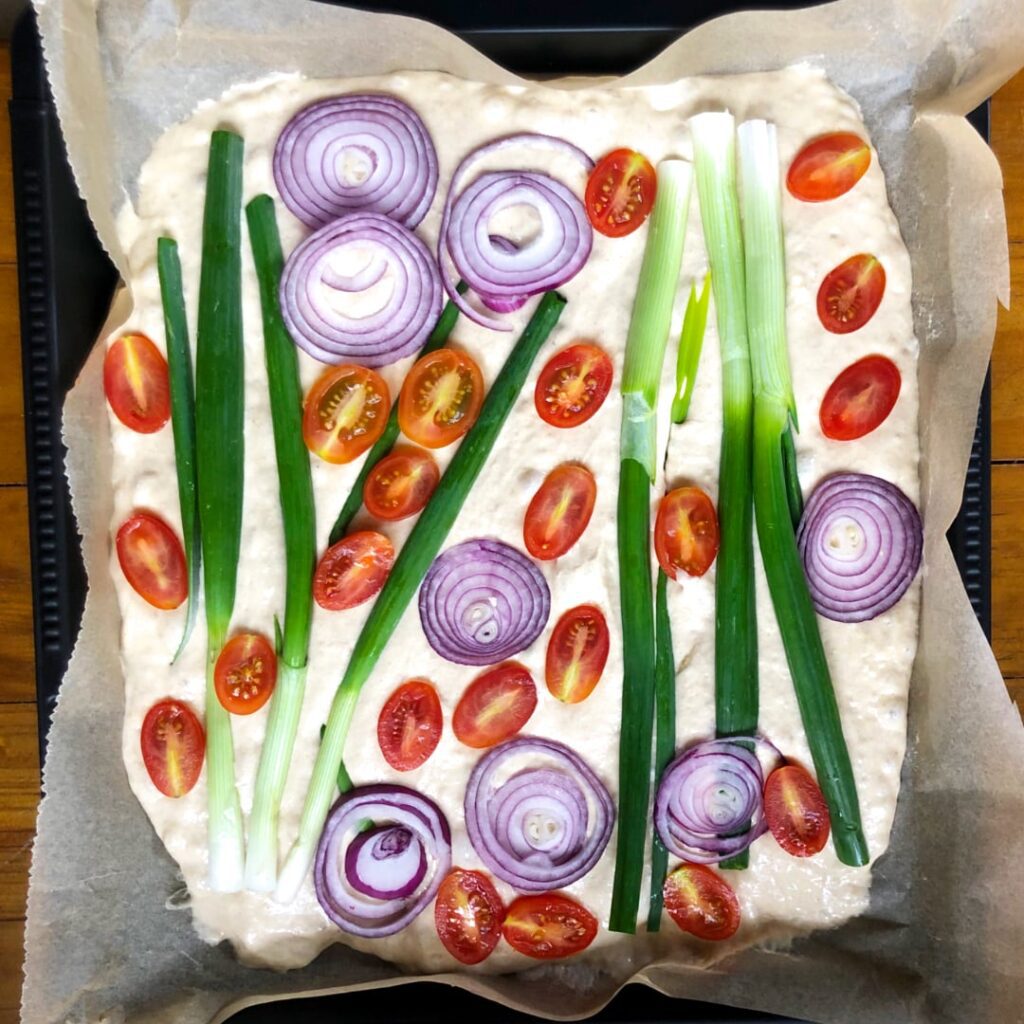- jetzt drückst du ganz leicht den vorbereiteten Belag in den Teig und lässt ihn am besten abgedeckt nochmal ca. 30 Minuten ruhen