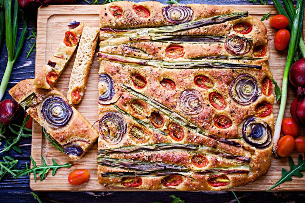 Das Besondere an Focaccia ist ihre einzigartige Textur. Der Teig wird mit Hefe zubereitet, was zu einer fluffigen, lockeren Krume führt. Die Oberfläche der Focaccia wird großzügig mit Olivenöl beträufelt, was während des Backens für eine knusprige Kruste sorgt. Das Öl dringt auch in den Teig ein und verleiht ihm einen herrlich aromatischen Geschmack.