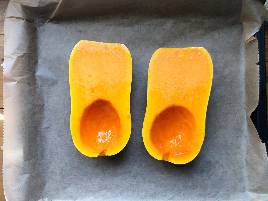 - Butternutkürbis waschen, der Länge nach halbieren und Kerne entfernen1 Stück Butternutkürbis