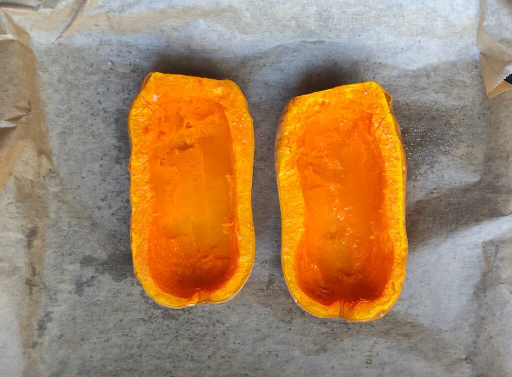 Dann halbiere den Butternutkürbis, entferne die Kerne, bestreiche ihn mit Olivenöl, streue etwas Salz darüber und backe ihn für 45 Minuten im Ofen.