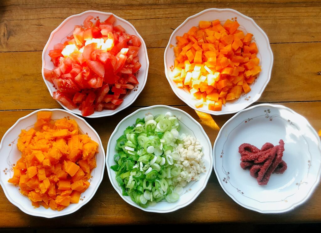 - Kürbisfleisch klein schneiden und unter die Gemüse-Hack-Füllung geben