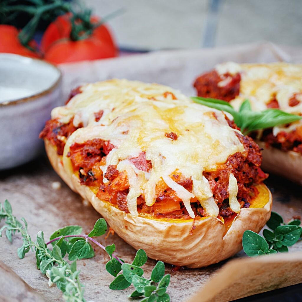 Mit dem Herbst kommt auch die Zeit für köstliche Kürbisgerichte in allen erdenklichen Variationen. Einer meiner Favoriten ist der vegan gefüllte Butternutkürbis, der das Herz eines jeden Kürbisliebhabers höherschlagen lässt. Die Füllung ist voller Aroma und herzhaft zugleich, mit einer Mischung aus veganem Hack, Frühlingszwiebeln, Karotten und Tomaten. Ein köstlicher Dip und z.B. ein frischer grüner Salat dazu runden das Ganze perfekt ab. Eine unwiderstehliche Mahlzeit, die an kühlen Herbsttagen wärmt und einfach nur köstlich schmeckt!
