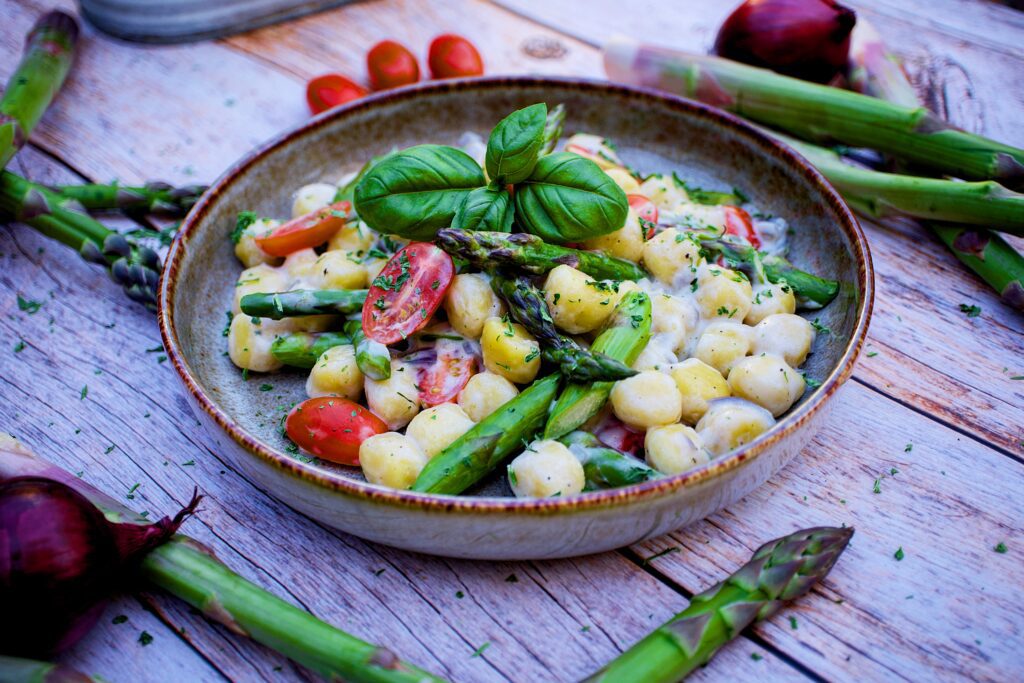 Und voilà, unser einfaches und dennoch raffiniertes Gericht ist fertig. Ein Teller voller Gnocchi mit knackigem grünem Spargel und Tomaten in cremiger Sauce!