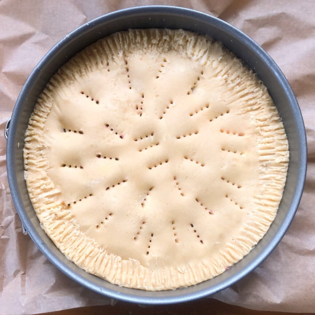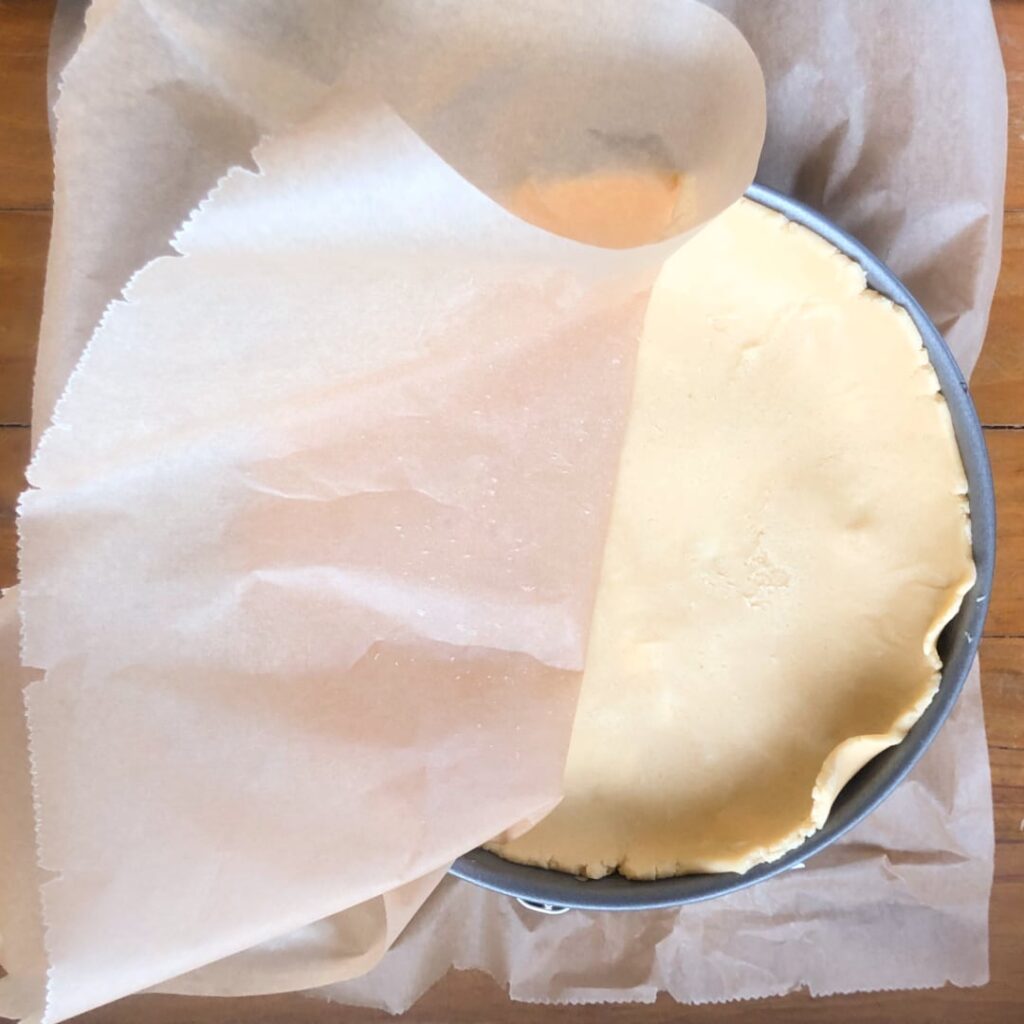 - Den restlichen Teig am besten zwischen 2 Backpapierhälfen auf die Größe der Kuchenform ausrollen
