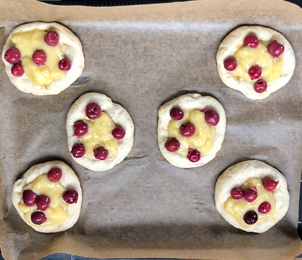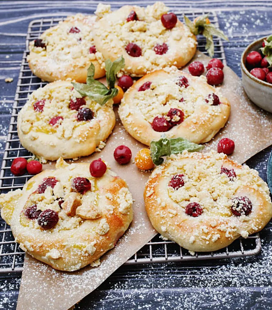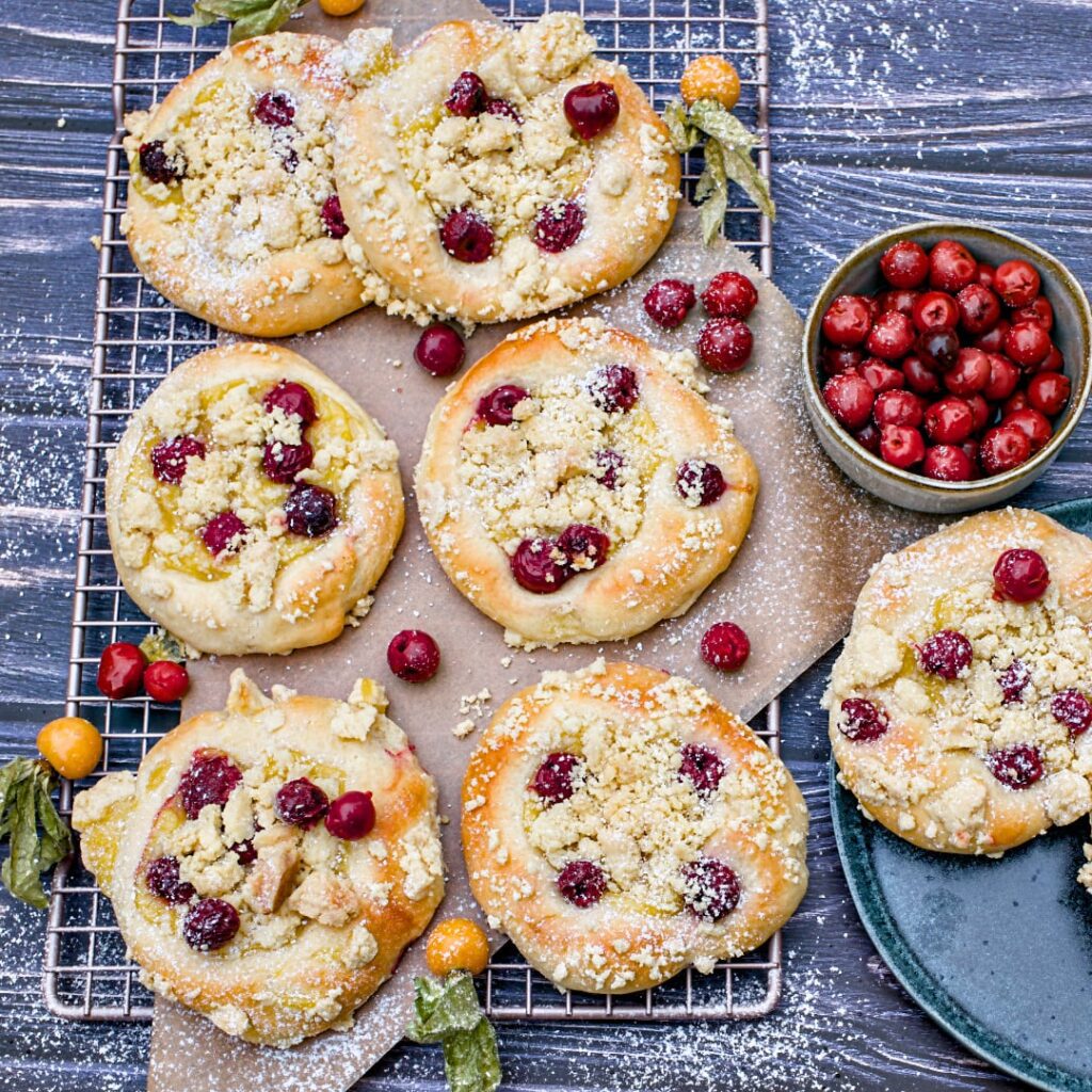Diese Streuseltaler mit Pudding und Sauerkirschen sind: