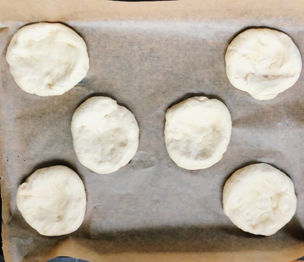 Nach der Gehzeit wird der Hefeteig in ca. 12 Kugeln geteilt und auf einem Backblech mit Backpapier etwas platt gedrückt. Dabei in die Mitte der Taler eine kleine Mulde formen.