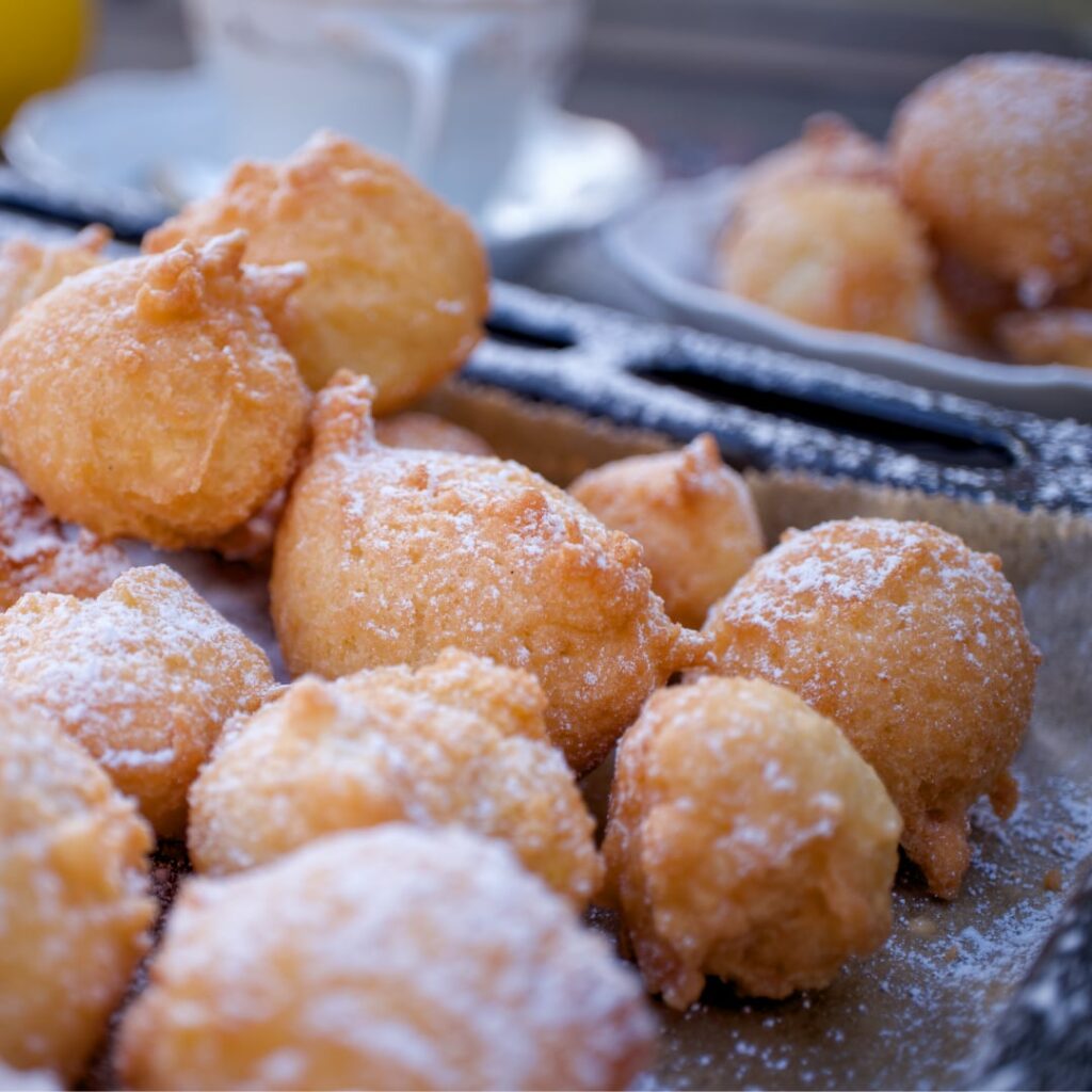 Für den Teig werden alle Zutaten vermischt. Dann noch Zitronensaft in den Teig und schon können die Bällchen in die Fritteuse oder den Topf.