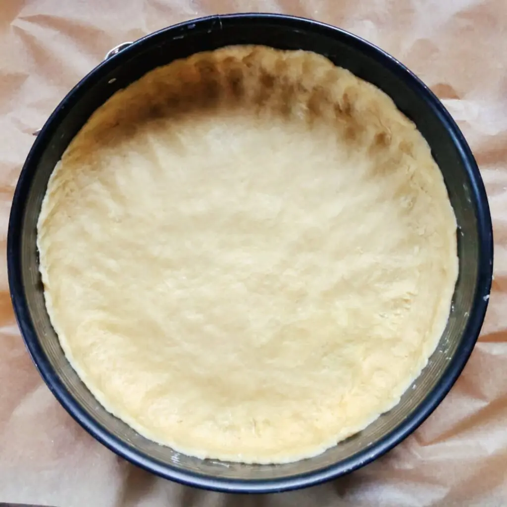 - Den Mürbeteig für den Boden in die Kuchenform geben und mit den Händen verteilen und einen kleinen Rand hochziehen. Am besten geht das mit etwas Mehl an den Händen