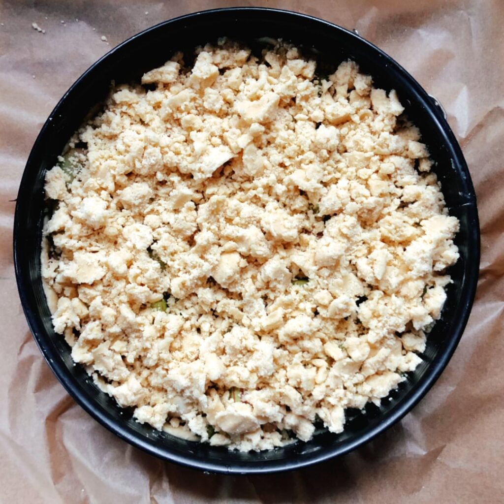 - Für die Streusel Mehl, Butter, Zucker und Vanillezucker in eine Schüssel geben und zu Streuseln kneten100 g vegane Butter, 100 g Zucker, 1 Päckchen Vanillezucker, 200 g Mehl